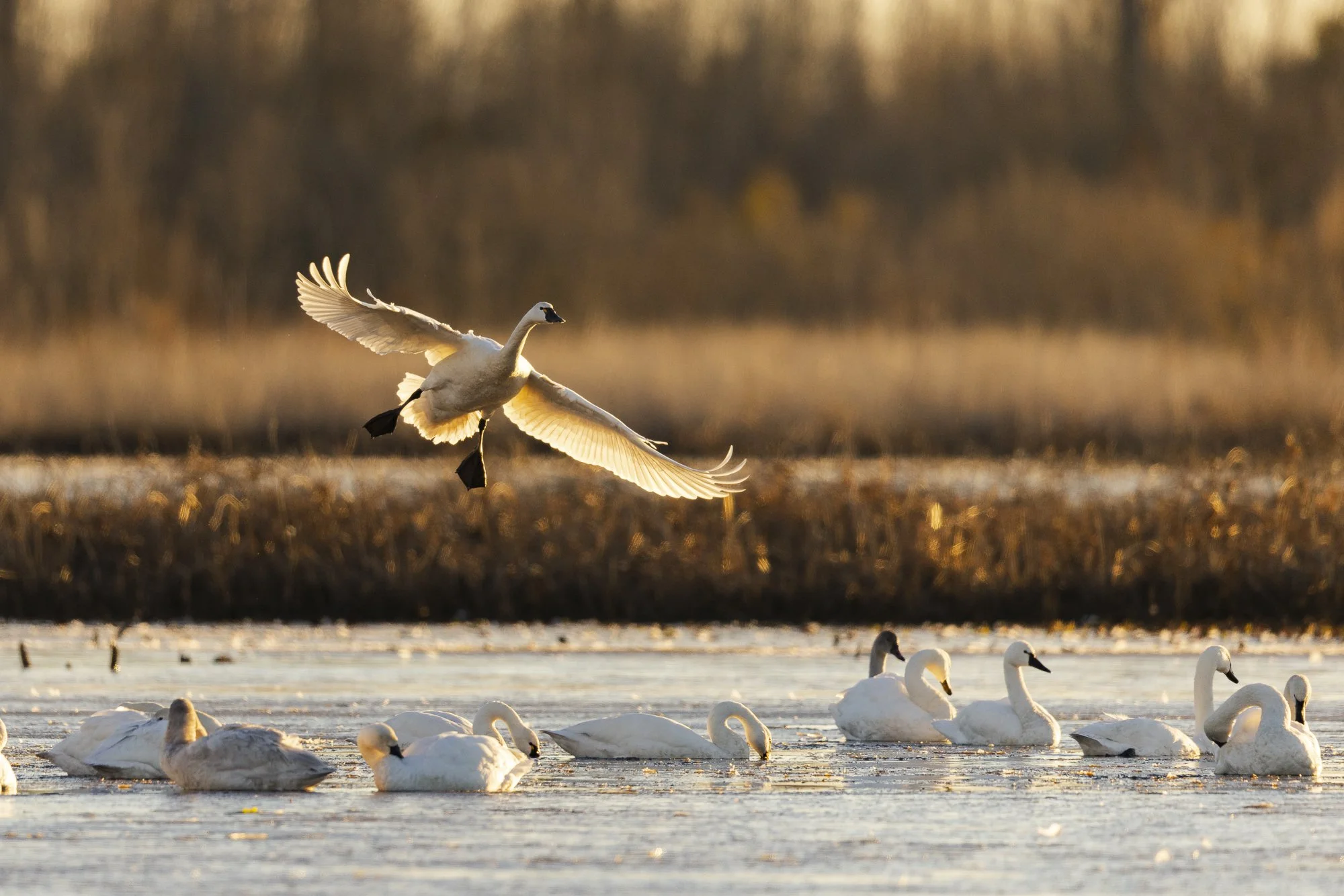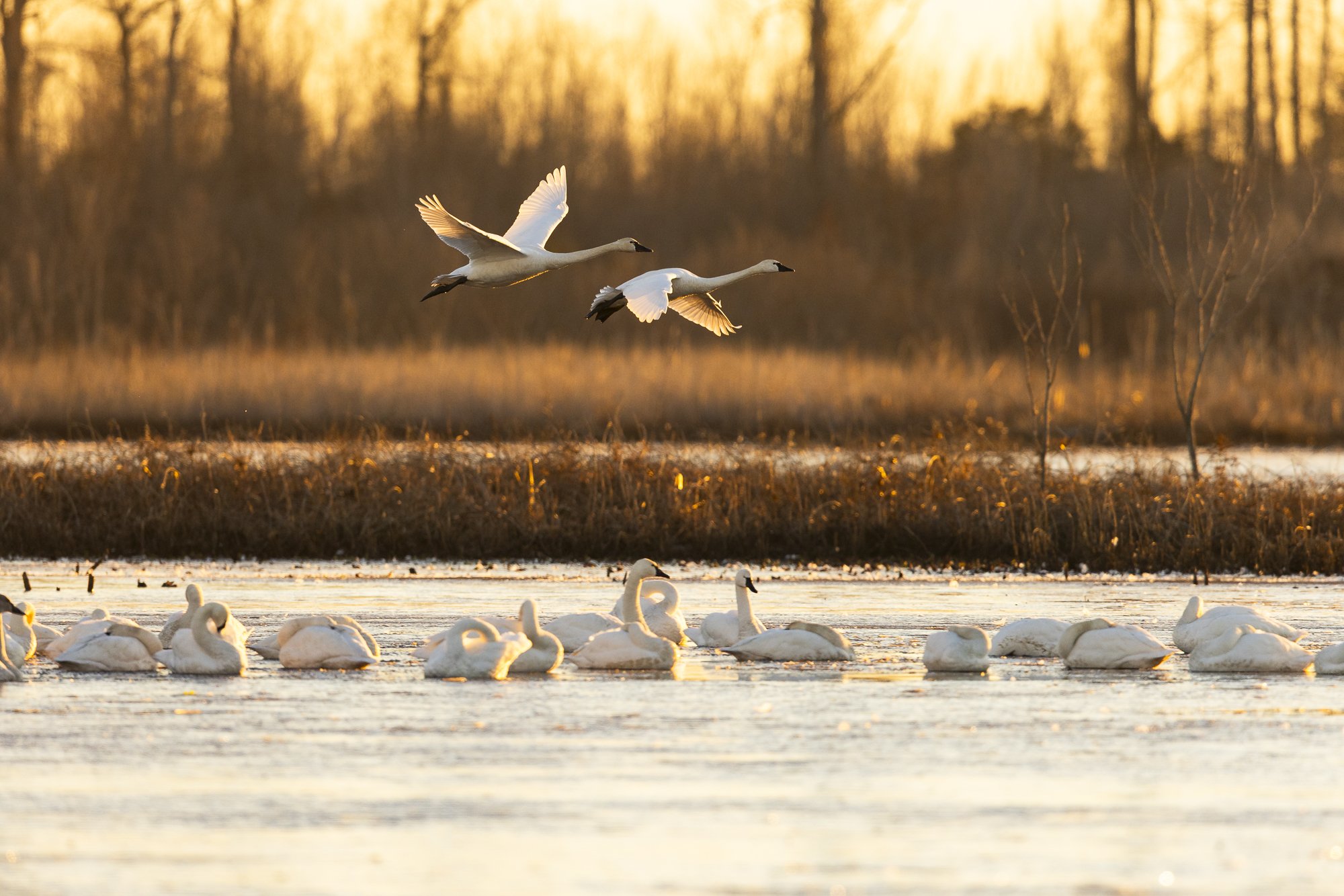 Wide perspective of tundra Swans silhouetted on a frozen impoundment at the Pocosin Lakes NWR.