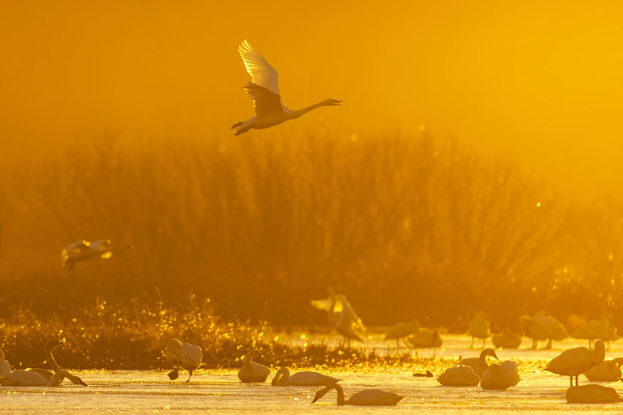 As the sun lift higher and higher I changed my shooting style to match the light I was given. The suns light was spilling over the top the trees and into the impoundment. Creating a glow of light filling the frame from left to right and top to bottom. Here I concentrated on the photographing swans in flight. I loved the sun’s rays but I also loved the backlit glow of the swans wings as they flew across the scene. You could under expose a couple of stops to make the background go completely dark, or like below, you exaggerate the suns glow to tell show off those beautiful sunrise colors.
