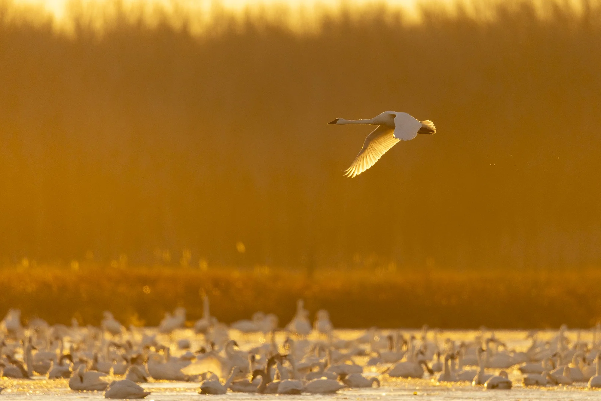 As the sun lift higher and higher I changed my shooting style to match the light I was given. The suns light was spilling over the top the trees and into the impoundment. Creating a glow of light filling the frame from left to right and top to bottom. Here I concentrated on the photographing swans in flight. I loved the sun’s rays but I also loved the backlit glow of the swans wings as they flew across the scene. You could under expose a couple of stops to make the background go completely dark, or like below, you exaggerate the suns glow to tell show off those beautiful sunrise colors.
