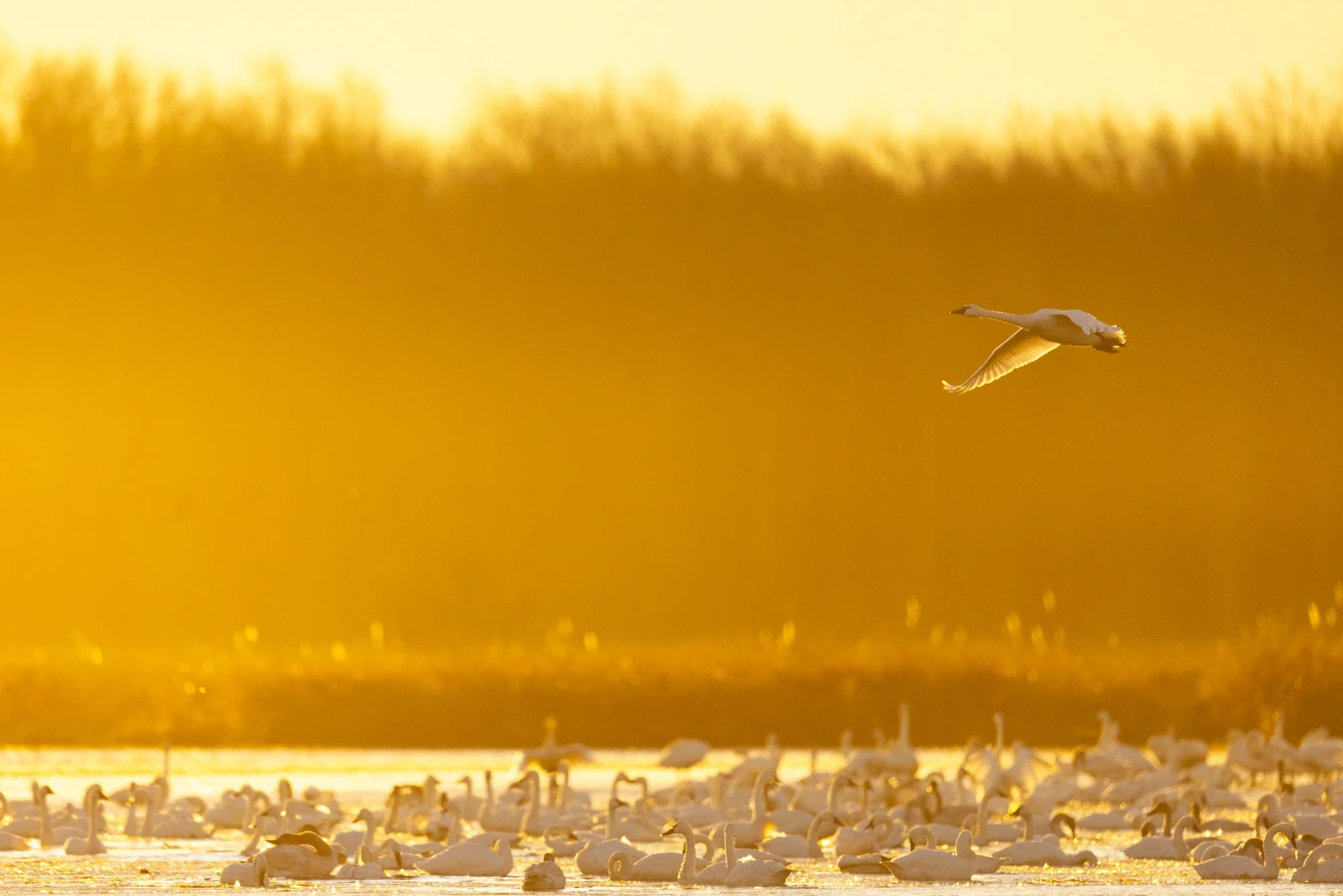 As the sun lift higher and higher I changed my shooting style to match the light I was given. The suns light was spilling over the top the trees and into the impoundment. Creating a glow of light filling the frame from left to right and top to bottom. Here I concentrated on the photographing swans in flight. I loved the sun’s rays but I also loved the backlit glow of the swans wings as they flew across the scene. You could under expose a couple of stops to make the background go completely dark, or like below, you exaggerate the suns glow to tell show off those beautiful sunrise colors.